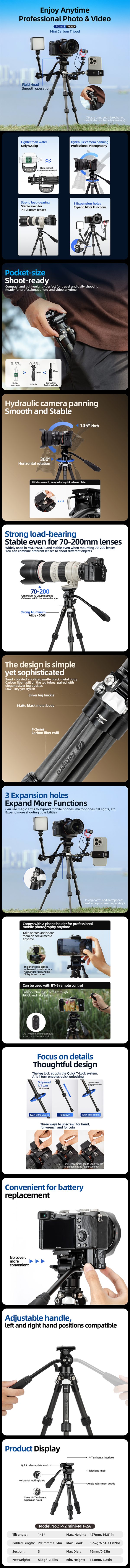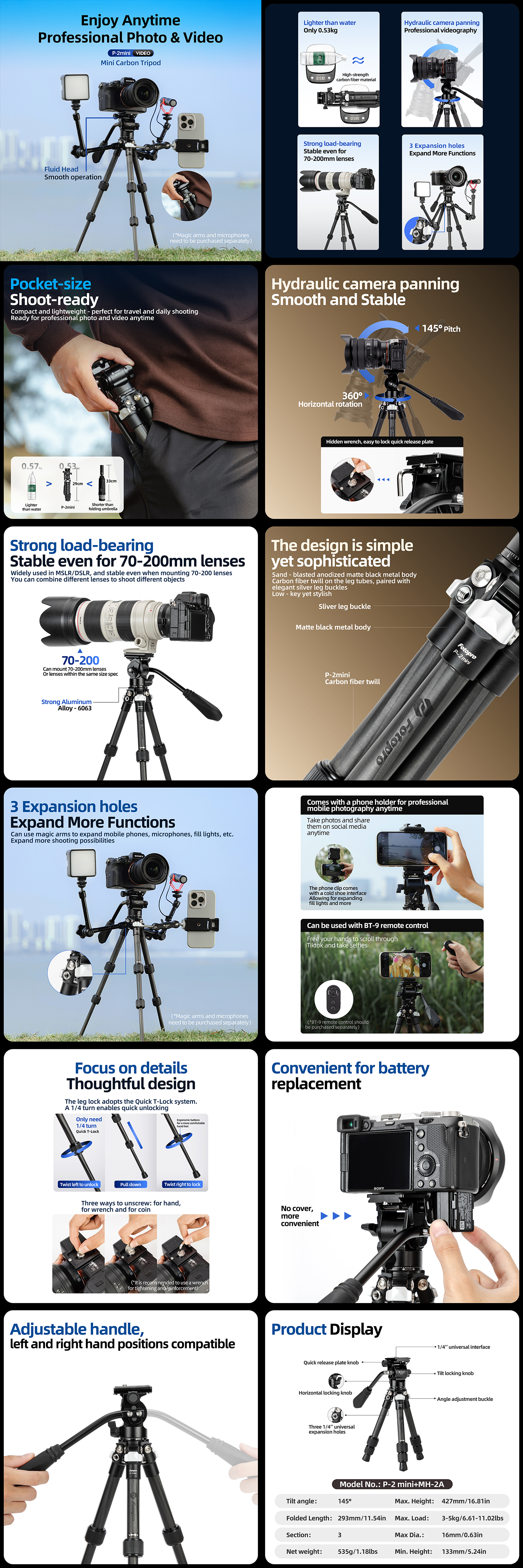 The P-2mini+MH-2A is a mini carbon video tripod. Weighing only 0.53kg (1.17lbs), this ultra-lightweight tripod features a hydraulic pan head for smooth 360° rotation and 145° tilt. Made with high-strength carbon fiber, it securely supports 70-200mm lenses. The quick-release plate and three expansion holes allow for versatile accessories like phones and microphones. Its compact size and user-friendly design make it perfect for travel and professional shooting on the go.
