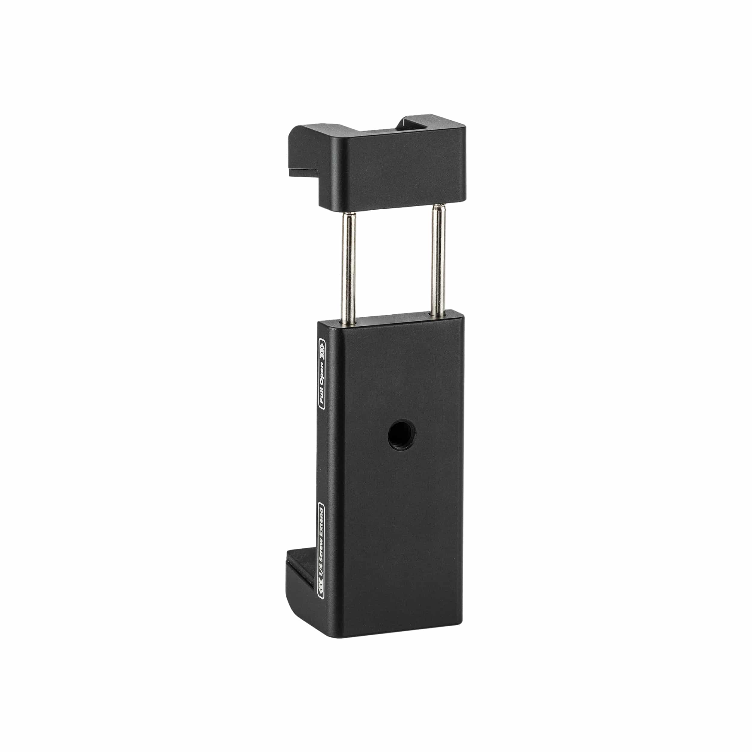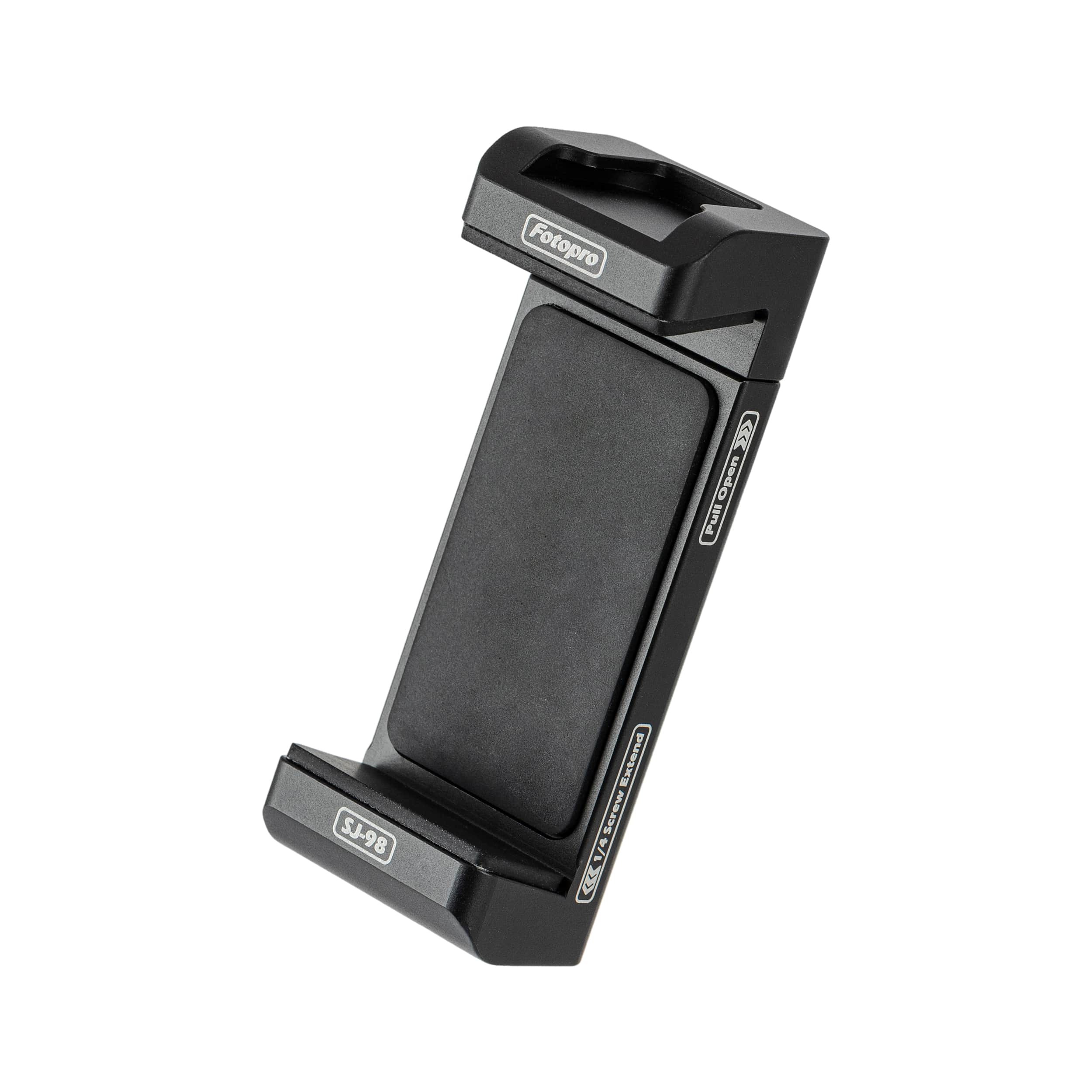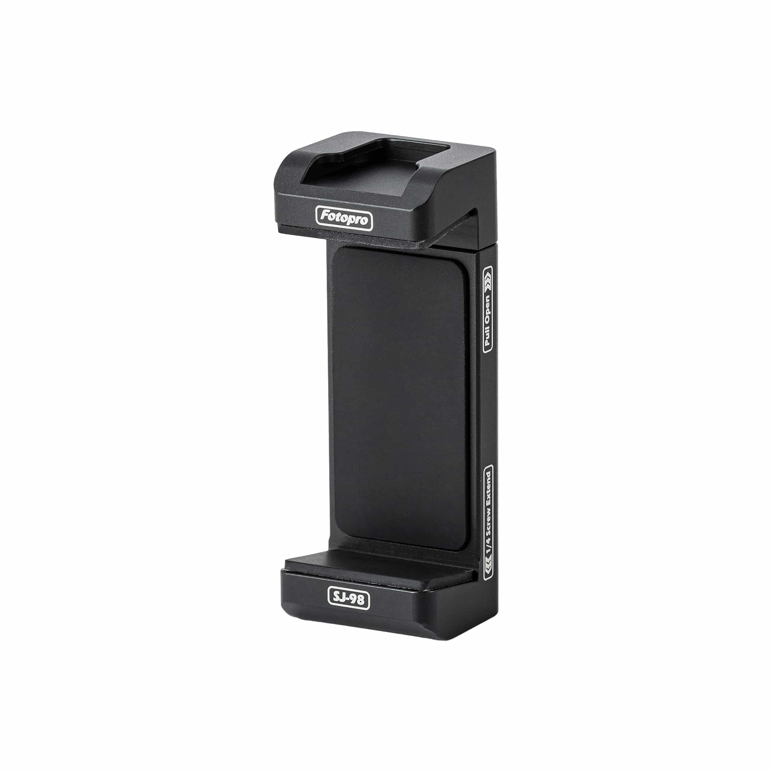 The Model SJ-98 is a metal phone clamp weighing 64.6 g (0.142 lbs), with compact dimensions of 30×24×77 mm (1.181×0.945×3.031 in). It features an adjustable clamp range of 58–88 mm (2.283–3.465 in), compatible with most smartphones. Integrated with 1 top cold shoe mount for accessories (e.g., lights/mics) and a standard 1/4″-20 screw hole at the base, it seamlessly attaches to tripods, monopods, and flexible arms (magic arms) for versatile mounting solutions.