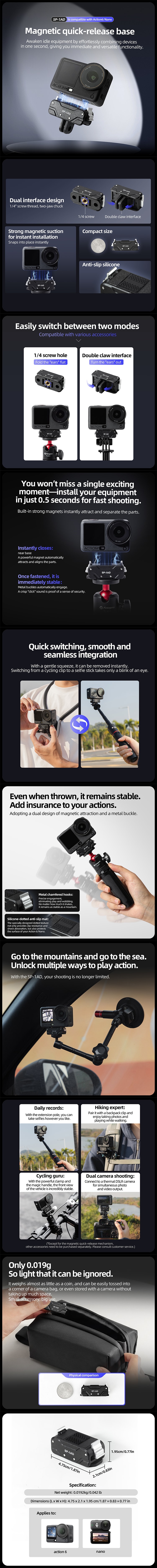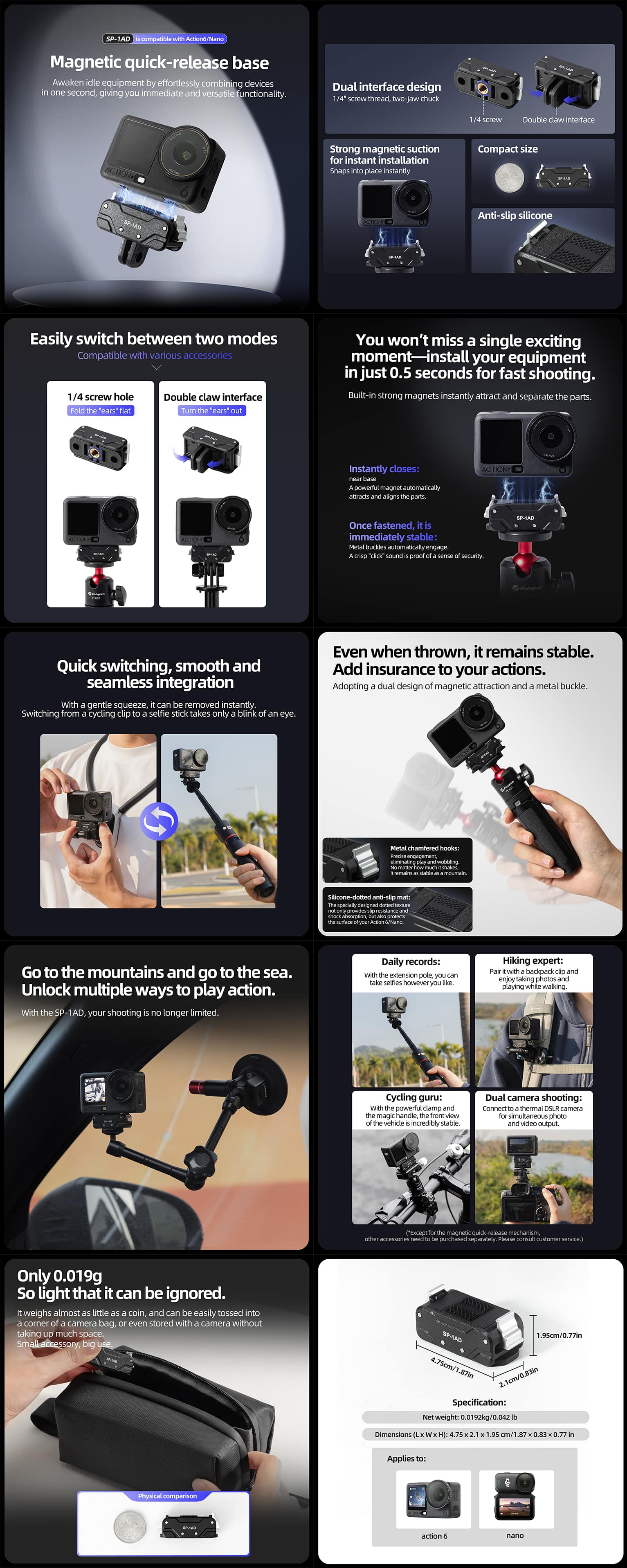 SP-2i Magnetic Selfie Stick Tripod with 1-second snap-on locking. 2-in-1 design: unfolds as a tripod, closes as a selfie stick. Supports horizontal/vertical and multi‑angle shooting with a 360° ball head. Foldable to just 15cm for easy carry. Compatible with insta 360 Ace Ace pro / Ace pro 2 / X4 / X5.